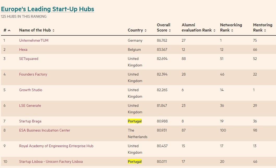 Among the six recognized Portuguese entities, four are established in Lisbon, but the table of Portuguese accelerators is led by Startup Braga, in 7th position, and Instituto Pedro Nunes is the other institution outside Lisbon to appear on the list of the best entrepreneurship hubs from Europe.