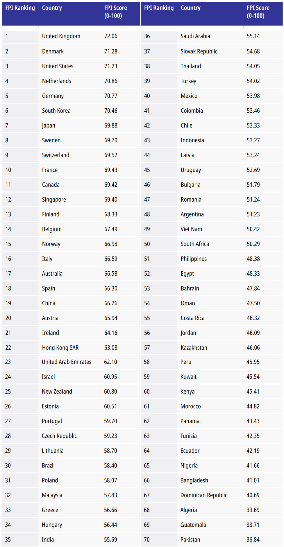 Overall, the FPI assessed 100 countries, selected based on their level of development, the availability of high-quality data, and the ability to ensure high-quality survey results, and compiled a list of the top 70.
